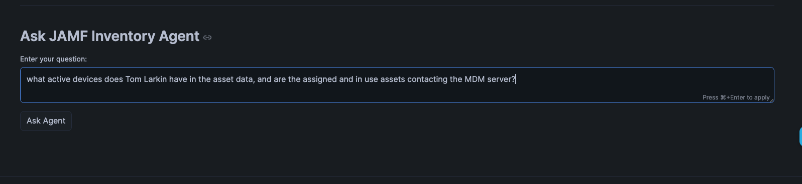 In the age of AI we are also starting to implement AI workflows into our work, and also into this Cloud Automation Stack. Keep in mind this is somewhere inbetween a POC and an MVP 1 for the AI features. This allows users of the data app to prompt it with natural language to get results. I simply asked it to display my active devices in the data. Which when you see the results, this definitely needs a bit more tweaking, but the basic core functionality is there today.