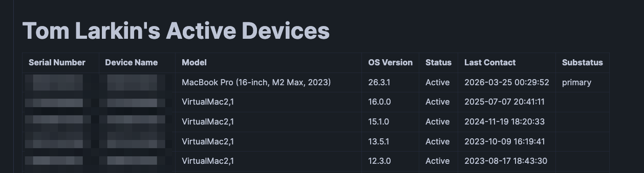 The Automation Stack can now run a job where it grabs every serial number of every macOS device that is in this state, passes them to the Lambda API stack, and from there we can make API calls back to our MDM to use their “automatic re-enrollment API,” which in returns automates the re-enrollment of a broken MDM client and putting it back into a working state. This is fully autonomous, with data coming into Snowflake from many sources of truth, executing queries that logically figure out what systems are in a broken state, then tells our Lambda stack to run the re-enrollment flow on them.