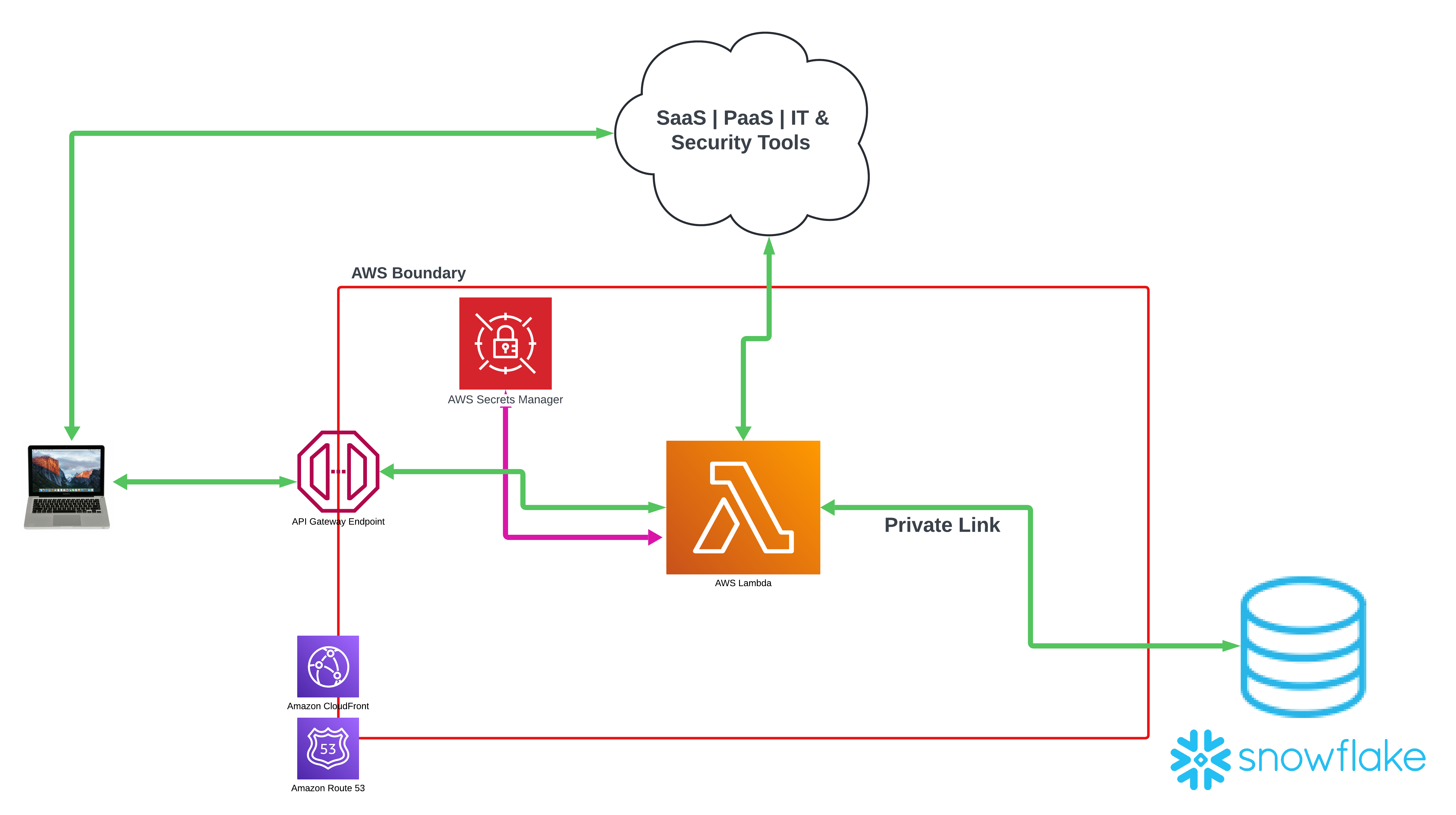 We can reuse this workflow for any REST API we want a client to communicate with. We do not have to put any credentials in scripts ever again! We just make sure the client interacts with the API Gateway, can pass some simple parameters to an API endpoint, and then have all the logic in the Lambda to do the actual work. Finally, to have the Lambda return the thing we wanted the client to do back to it. This is an omnidirectional architecture. The inverse of this is true as well, as we can have queries run in Snowflake that call the Lambda stack via external function, which in the end will talk to our MDM and can now potentially put end user devices in scope of an MDM workflow.