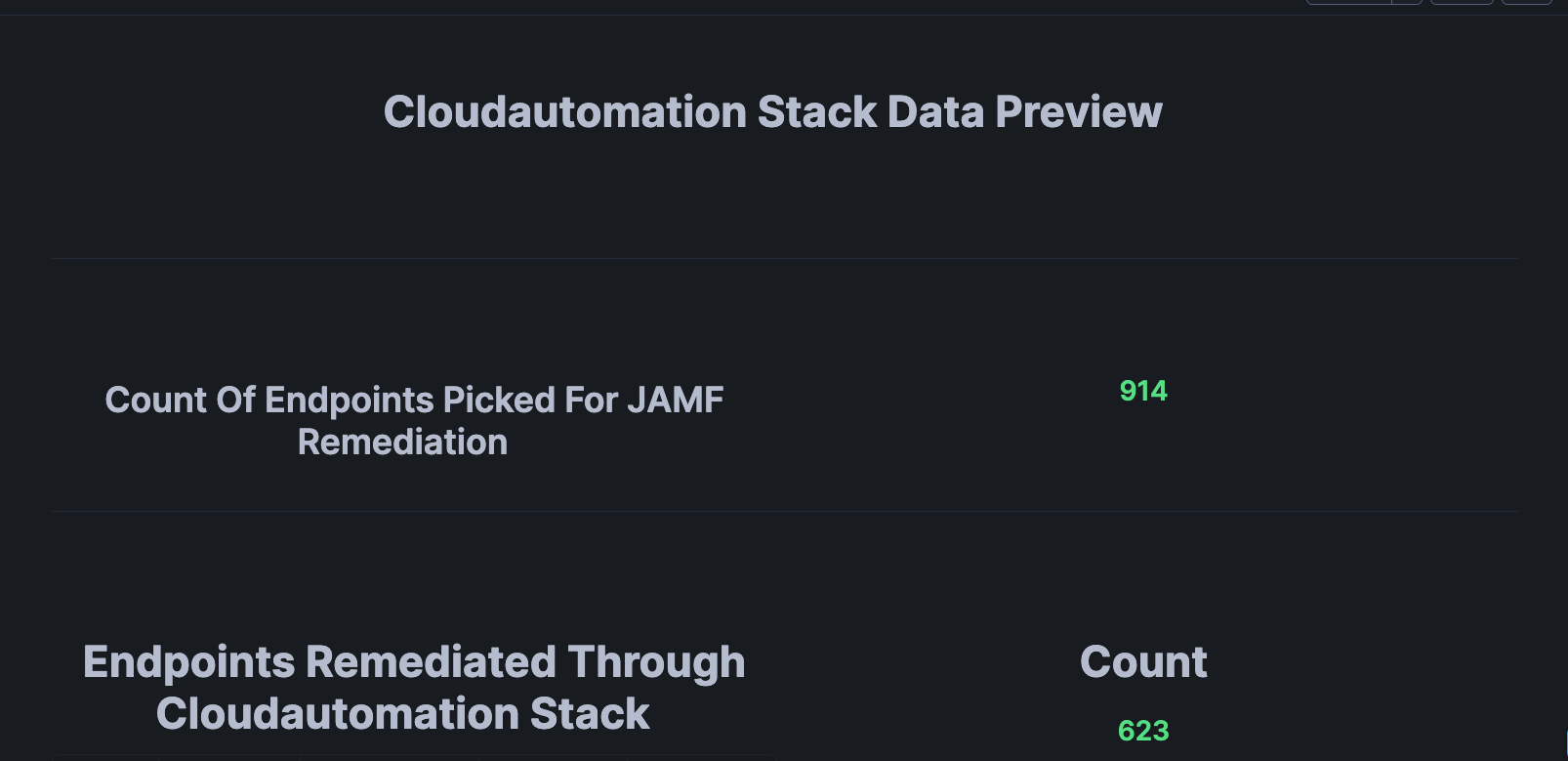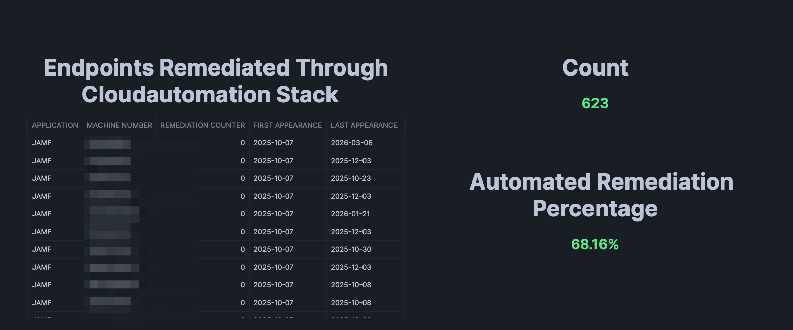 In this visualization we can see the devices that were not able to be automatically fixed with automation. This is likely due to some weird edge case, or the system is just in such a bad state it likely needs a reboot, or maybe even some IT support troubleshooting. For these cases our Cloud Automation Stack can automatically talk to our service desk system and generate support tickets for a human to take over and troubleshoot. So, again we are leveraging automation for when the automation fails. When we get into this state, our Cloud Automation Stack will know to instead of trying to fix the device to cut a support ticket instead so a human can take over and look at it.