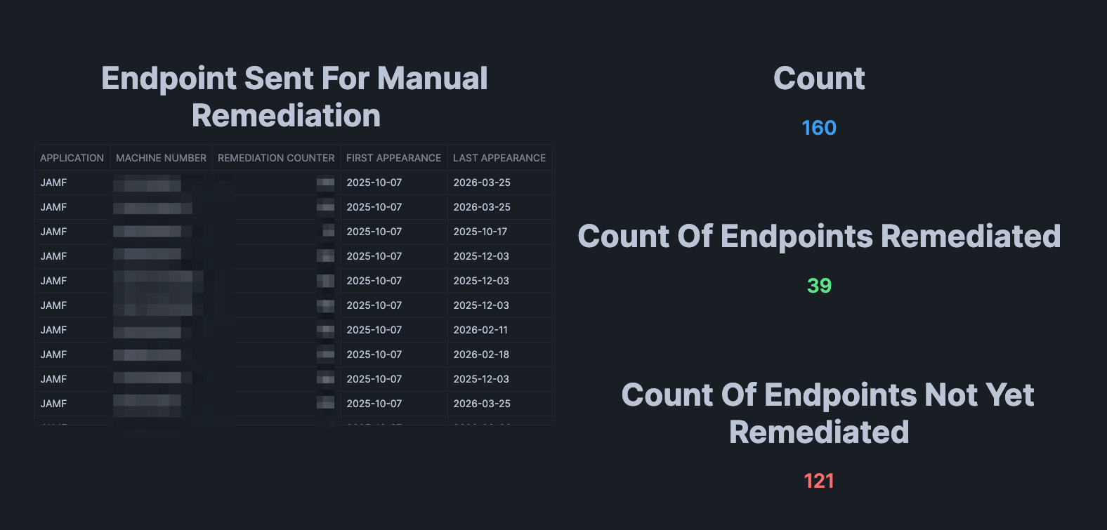 In the above screenshot we can observe a basic high level overview displaying the total lifetime number of endpoints we have detected with a broken MDM client and/or binary. Then the number below it is the total number of endpoints we have completely fixed with silent automation.